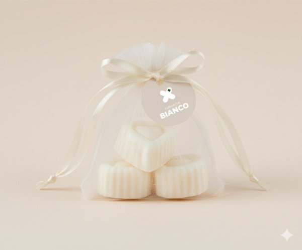 Mini jabones en forma de corazón, aromáticos y hechos a mano, presentados en bolsitas de organza con etiqueta personalizada.